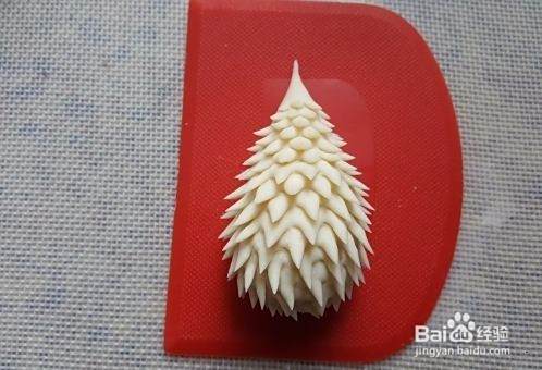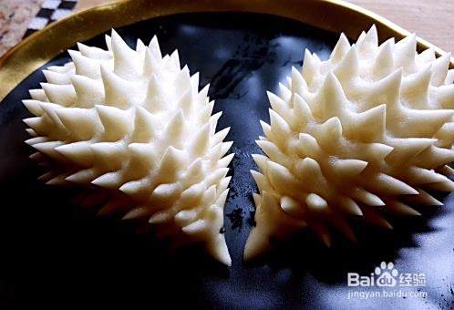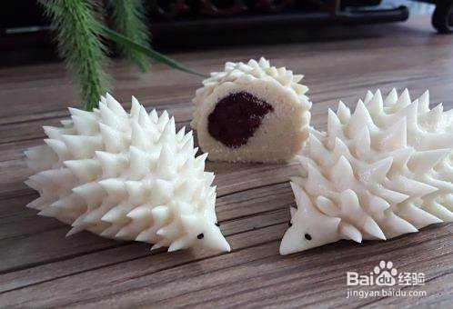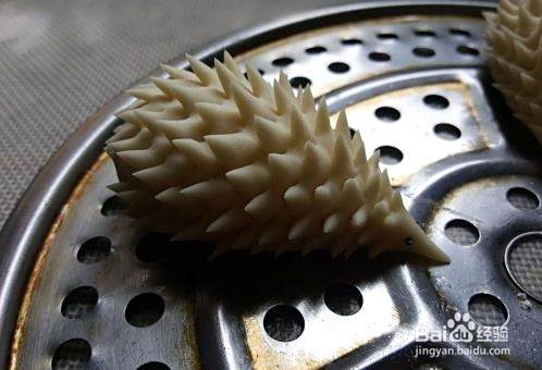 剪好的小刺猬,取两个黑芝麻分别扎在眼睛的部位,开水上屉蒸12分钟左右即熟。
