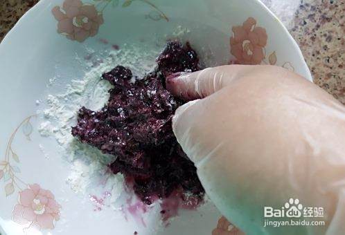 戴上手套后,将玫瑰酱与手糕粉混合。