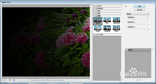 选择滤镜,龟裂缝,设置裂缝间距为27,裂缝深度为6,裂缝亮度为9,点击确定,如图