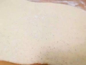 用擀面杖将面团擀成厚度5mm左右的面皮