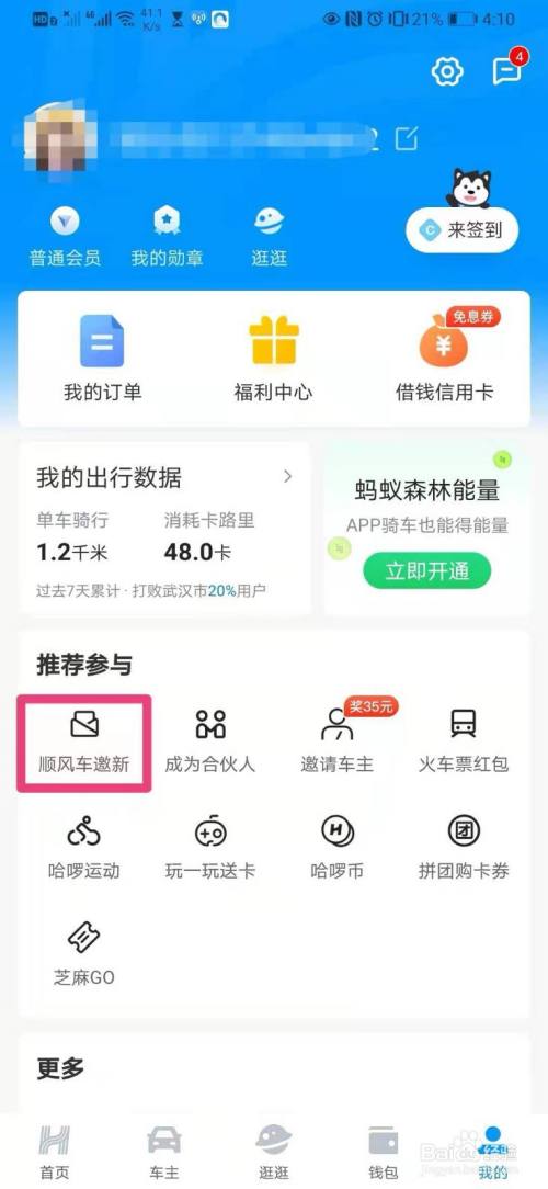 打开手机哈啰出行,点击右下角“我的”,页面跳转后,点击”顺风车邀新“。