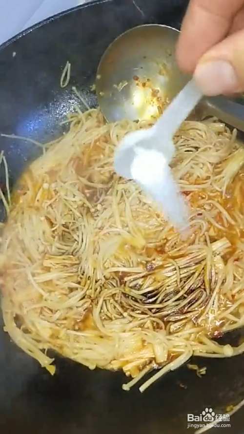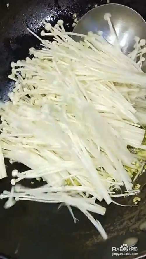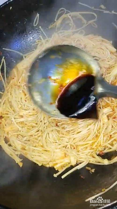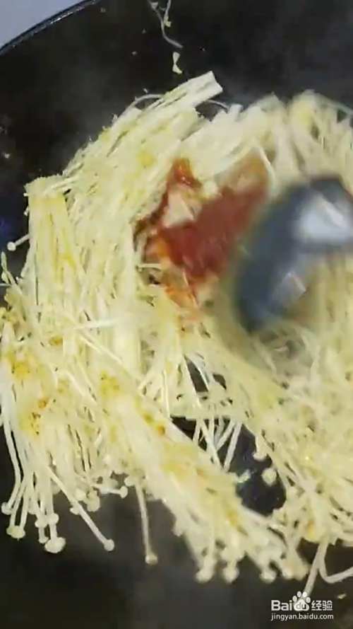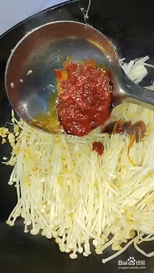 再下入金针菇翻炒均,再加入蚝油,蒜蓉辣酱翻炒均匀。