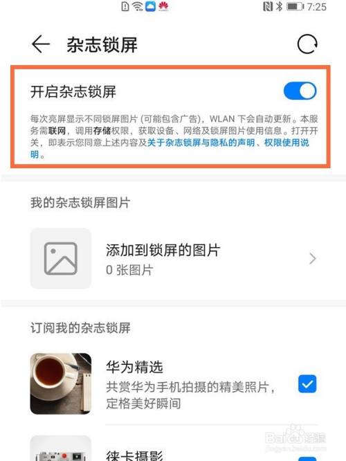 3、打开【开启杂志锁屏】右侧的开关,开启杂志锁屏后,手机默认显示步数。