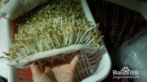 差不多就还有最后一步了,先用一张白布放在水盆的底部,把洗好的黄豆和绿豆都放在白布上,用另一张百度搭上,浇上一定分量的水就好了