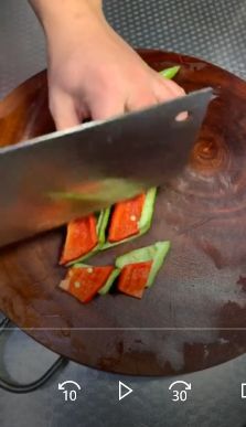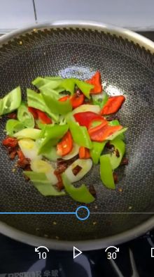 锅中放油放辣椒 葱段 青红椒块翻炒,淋入料酒 加蚝油 生抽;
