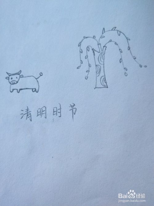 如图,在小牛的下方写上“清明时节”字样。