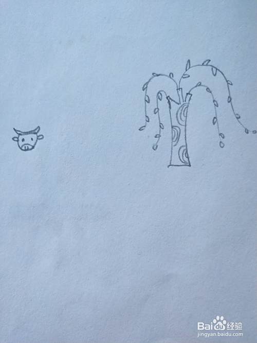 如图,在树的一侧画出小牛的头部。
