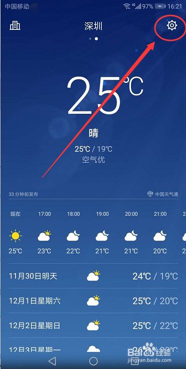 打开手机里面的 天气,在首页的右上角有个 设置 按钮,如下图