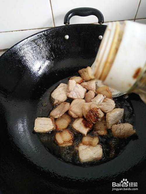瘦肉倒入之后,即可添加酱油、醋以及食盐等调料。注意盐要少放,小半勺即可;现在放盐只是为了让肉质更加入味。