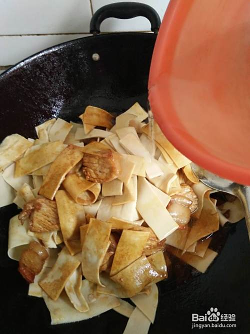 然后在锅里的瘦肉片块熟的时候把切好的千张放入翻炒,翻炒过程中用锅铲轻轻的将黏在一起的千张抖开。