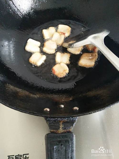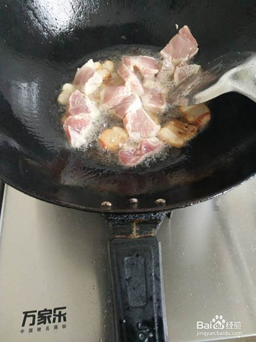 接着,打开灶火,炒锅内添入一勺半食用油并将切好的肥肉先行放入,油炼差不多之后将瘦肉也倒入。
