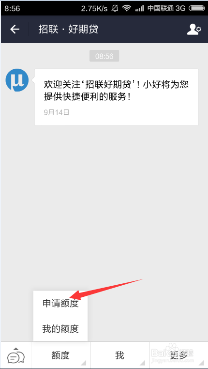 进入好期贷聊天对话框界面,点击下方的【额度】选项,在弹出的菜单栏里选择【申请额度】