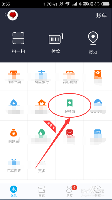 打开支付宝手机客户端,进入登录界面,输入账号密码进行登录,登录成功进入主界面,点击【服务窗】选项