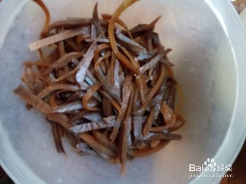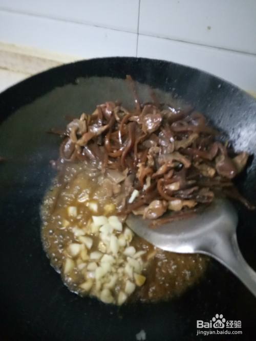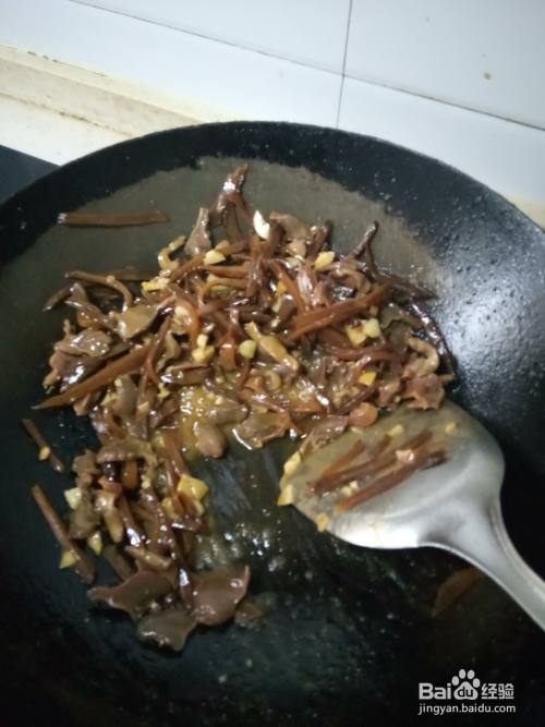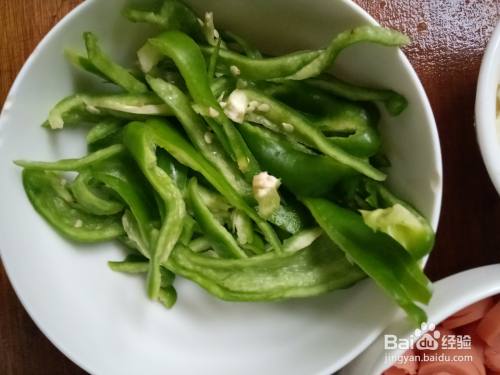 大头菜切成细丝后漂洗干净,控干水分。青椒去楴去籽清洗干净后切成细丝。大蒜剥好后切碎。鸡胗清洗干净后切成块,加入少许的生抽搅拌均匀。