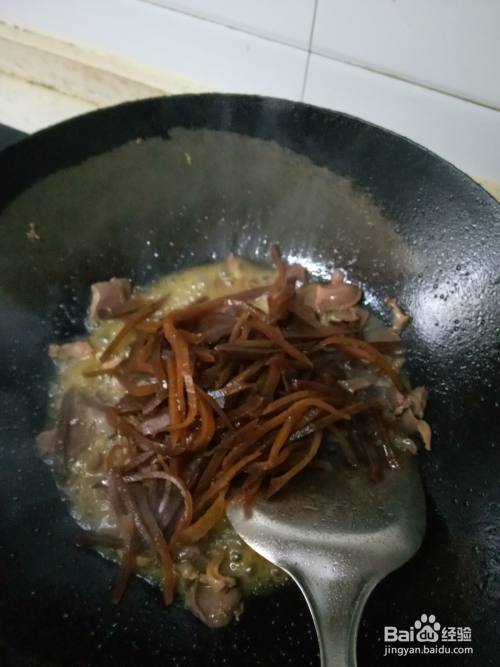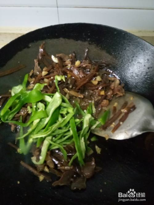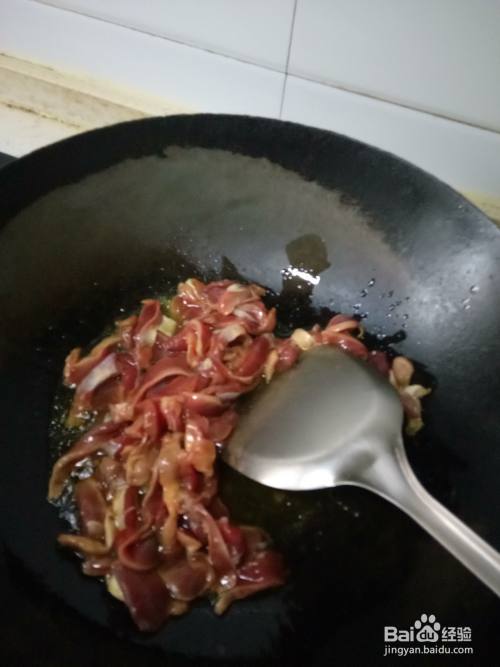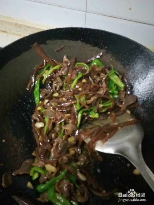 炒锅预热后加入适量的油,油温升起后倒入鸡胗,翻炒至变色后加入大头菜,继翻炒几下后调入适量的盐、南德、生抽翻炒均匀。接着加入大蒜,翻炒出香味后倒入青椒,继续翻炒。