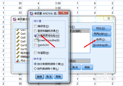 然后打开单因素方差分析对话框,然后将要分析方差齐性的变量放在因变量列表中,将要单因素分组的变量放在因子中