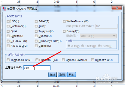 接着打开【两两比较】,然后将显著性水平调整为0.05