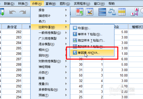 打开一份要进行单因素方差齐性检验的数据表,然后点击【分析-比较均值-单因素方差齐性检验】