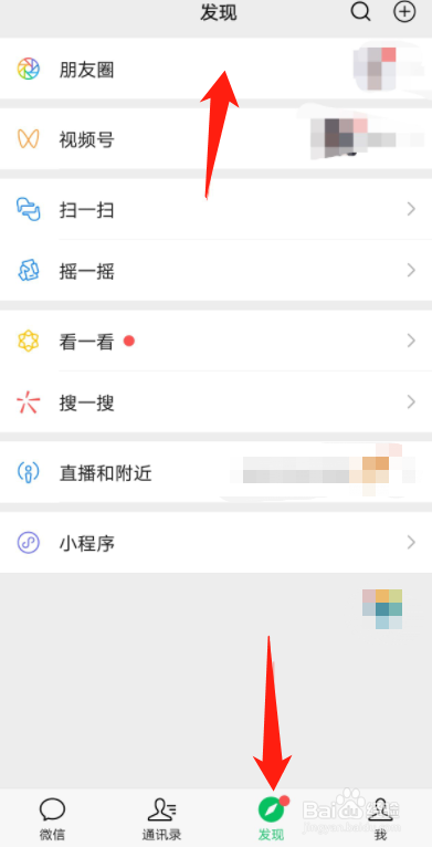 第二步、点击右下方的--发现 ,然后接着点击上方的--朋友圈