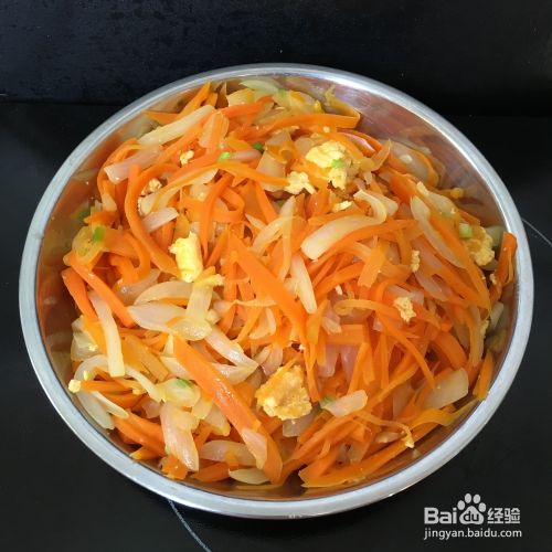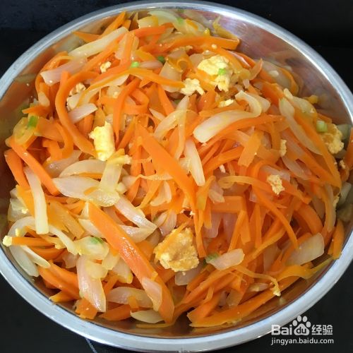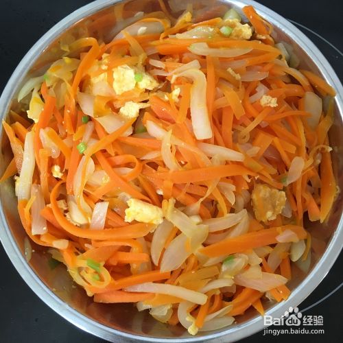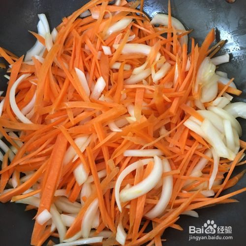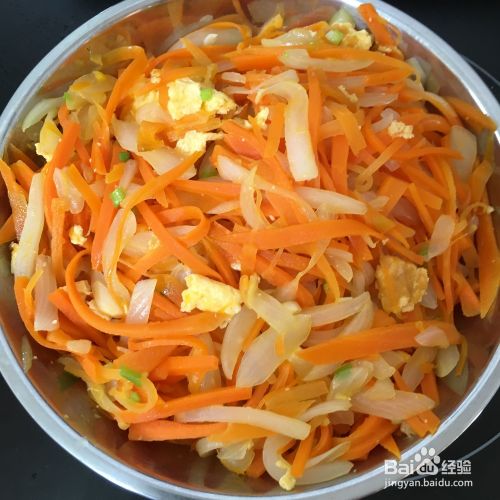 炒好鸡蛋的锅不用洗,继续加食油,将胡萝卜和白洋葱倒入,翻炒均匀。