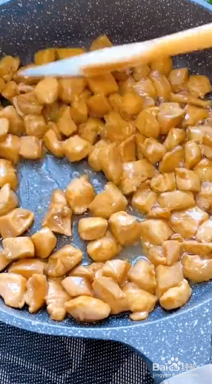 起锅烧油倒入腌制好的鸡肉翻炒,加入辣椒继续翻炒,最后倒入调好的料汁,大火收汁就制作完成了