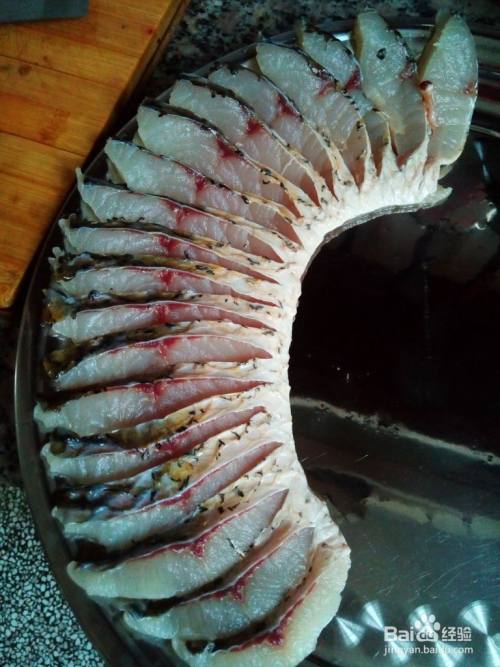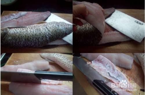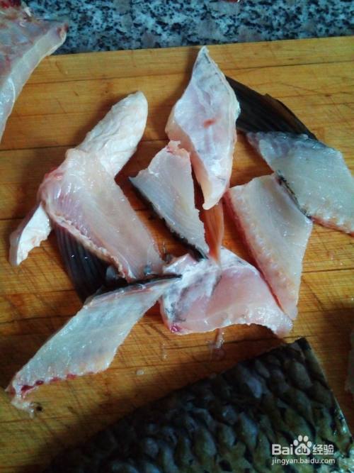 像片酸菜鱼的方法一样,将鱼头、鱼骨、鱼尾分开。最大的两片肉平摊开,片去鱼刺(就是两扇整个的鱼排骨)