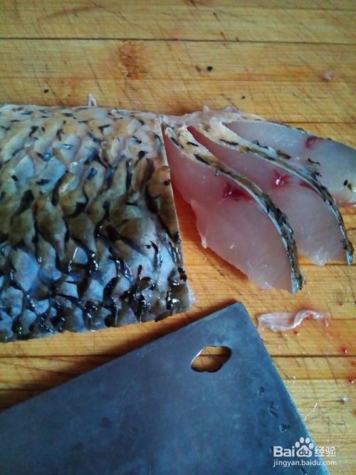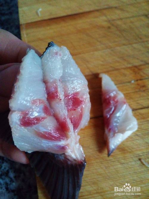 鱼尾放平,从一个角斜着片一刀,片开后肉翻起来是三角形的,如下图。