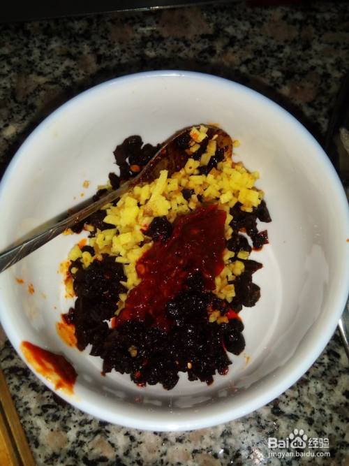 将剁好的豆豉、老干妈放碗里,加一勺辣妹子(或者别的鲜味辣椒酱都可以),放入葱花、姜末、蒜末,调匀。