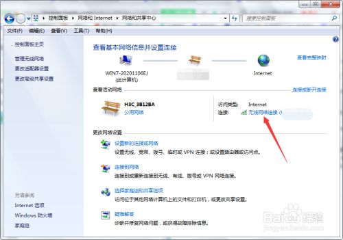 在网络和共享中心找到电脑连接的WIFI入口,点击进入查看无线网络连接状态。