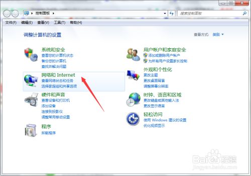 在控制面板的主页找到“网络和Internet”,点击进入。