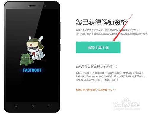 接下来就会显示获得解锁资格页面,点击“解锁工具下载”按钮,把解锁工具下载到本地,然后解压后运行