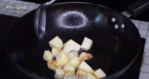 2将土豆洗干净切成块,起锅烧油放入土豆块煎两分钟盛出备用,再次热锅下油。