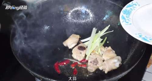 3放入鸡块翻炒至金黄,加入干辣椒,葱,段,大蒜,姜片,土豆块,酱油翻炒。