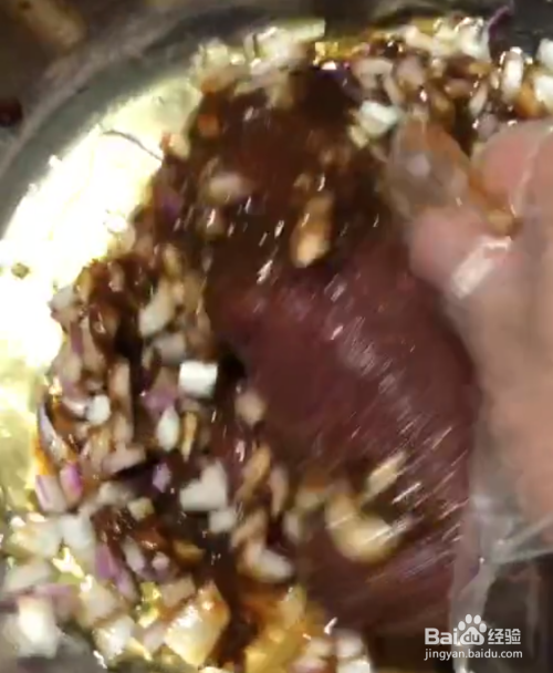 加洋葱沫,抓均匀,腌制50分钟,如下图。