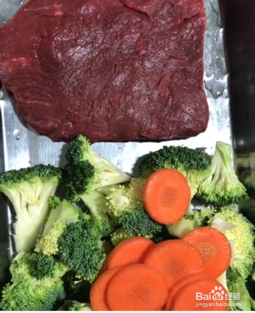 将牛肉洗净切大片,红萝卜切片,西蓝花备用,如下图。