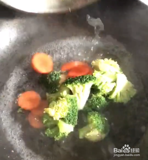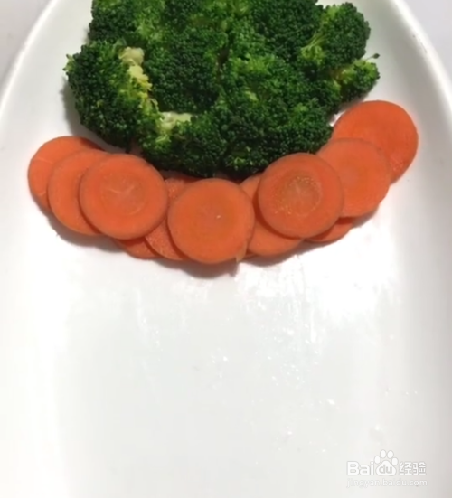 锅开后捞出西蓝花和红萝卜摆盘,如下图。