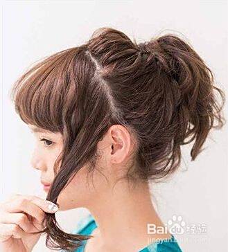 以耳朵为分界线,后面的头发扎成蓬松高马尾,前面多出来的头发这合成一束。