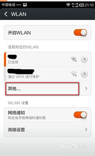 它会显示附近的无线网,因为我的是隐藏的他是搜索不到的。我们点击”其他“