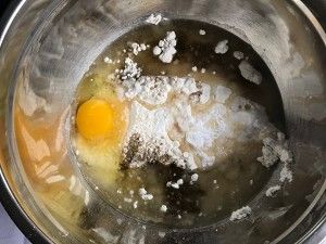 将玉米油、全蛋液、低粉、泡打粉、小苏打、椒盐全部倒入和面盆搅拌均匀