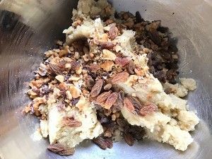 接着放入核桃碎、葡萄干搅拌均匀,可以戴上一次性手套揉成面团