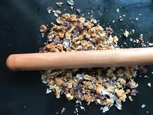先将核桃仁放入烤箱170度,烤箱中层烤制10分钟取出晾凉,然后将核桃仁放入保鲜袋用擀面杖压成小碎块