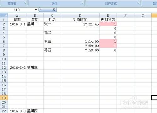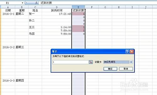 为了便于查看员工的迟到记录,我们还需要用“条件格式”这个功能来突出显示。选中整个E列,按“开始”→“条件格式”命令。
