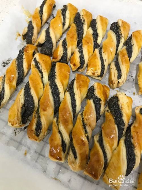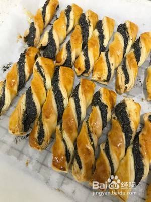 在薄片的上半部分均匀抹上芝麻馅儿、然后对折、边边压实、然后用擀面杖轻轻擀一擀。锋利的刀切成长条、扭一扭放入烤盘中、表面刷一层薄薄的全蛋液(不要摸到馅儿上哦)