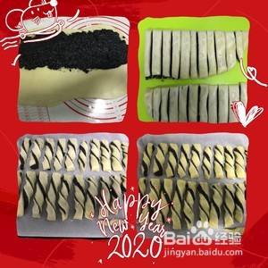 芝麻馅部分:取20克面粉、放入无水无油锅中、小火炒香、和80克黑芝麻粉混合、加入2克盐和1勺五香粉、混合均匀后加入玉米油、拌均备用