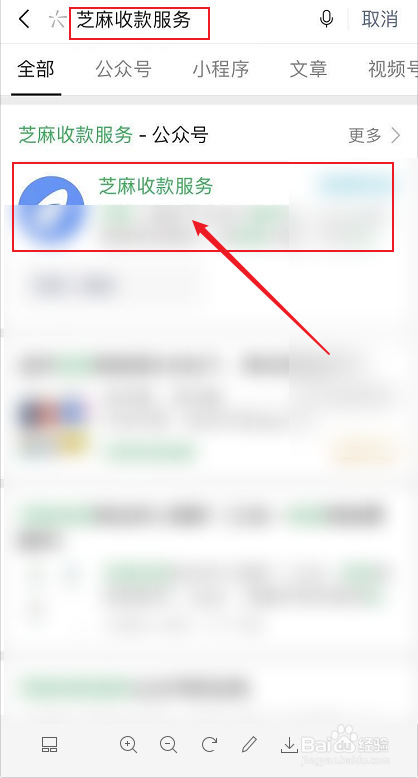 首先打开并登录微信app,搜索栏搜索【芝麻收款服务】点击进入官方公众号
