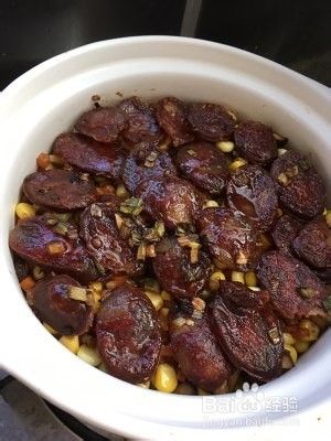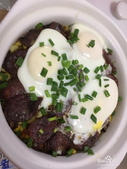 砂锅米饭焖的差不多了就把配菜平铺在米饭上面,再把腊肠铺好后就可以把鸡蛋打在上面后盖上盖再开中小火煮3分钟左右后关火焖七八分钟。