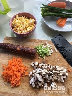 在煮米的时候这边就可以把配菜炒一下,我是先把锅烧热放入油把切片好的腊肠放入炒香后装盘备用,再把小葱放入炒香再把其余配菜、胡萝卜、玉米、香菇依次放入炒,再加生抽2勺、耗油1勺,、胡椒粉一小勺一起炒香备用