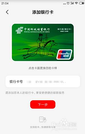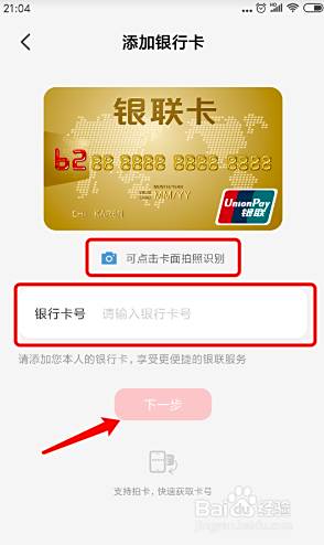 点击拍照图图标,可以直接拍摄银行卡正面,直接拍照识别银行卡号,或者在输入框中直接输入银行卡号,点击“下一步”按钮。