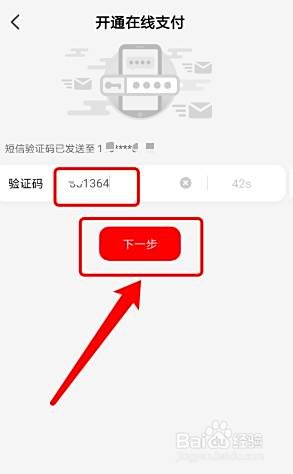 进入在线开通支付页面,输入银行卡绑定的手机收到的验证码,点击“下一步”。