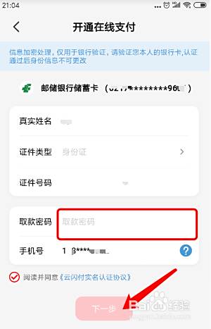 姓名及证件照信息会自动读取,输入银行卡交易密码,点击“下一步”。
